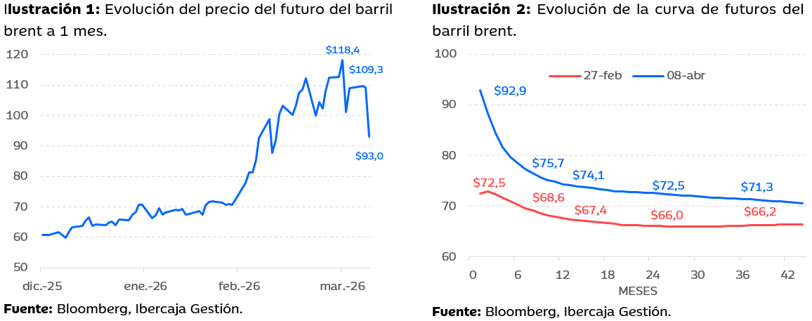 La reacción lógica del mercado ha sido tumbar el precio del brent desde los $110/barril hasta los $92, una caída cercana al 16%. La curva del brent se ha desplazado consecuentemente, reflejando que el mercado le da una mayor probabilidad al escenario de desescalada rápida. Sin embargo, todavía no nos acercamos a niveles preguerra y lo más probable es que debido a la destrucción de infraestructura, los barriles perdidos durante este tiempo y la prima de riesgo, el barril brent se estabilice en el rango $80-90/b.
