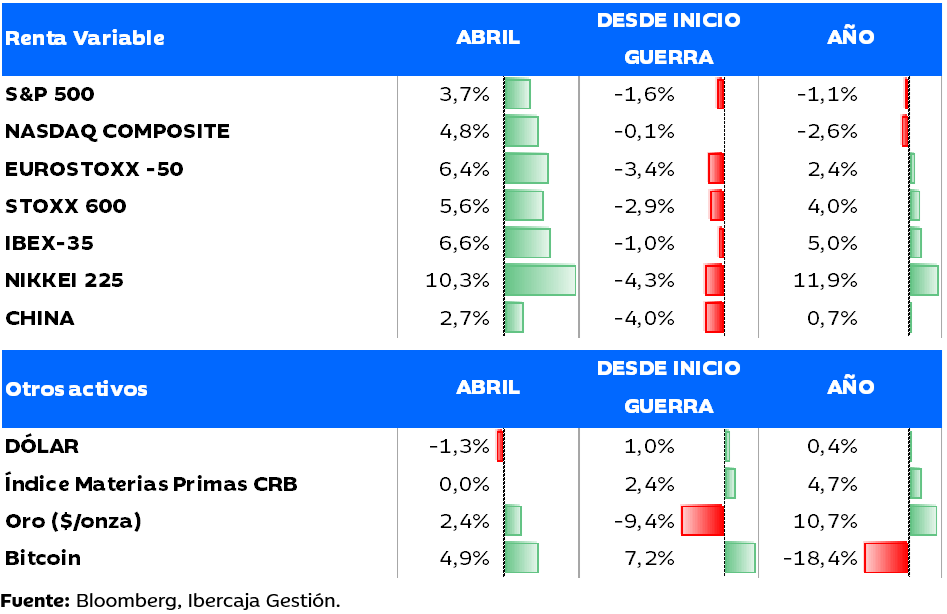 En renta variable, el movimiento al alza empieza favoreciendo aquellas geografías y sectores que más han sufrido a lo largo de marzo. Por geografías, rebotan Japón y Europa y por sectores, lideran la subida tecnología, bancos y consumo discrecional.
