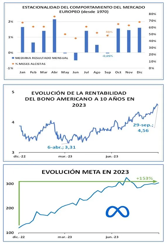 Meta connect (antes Facebook connet y Oculus connect) es el evento anual de Meta (dueño de Facebook, Instagram y Whatsapp) en el que actualiza al mercado sus avances en el desarrollo de la realidad virtual. Este año ha presentado sus nuevas gafas de realidad virtual Meta Quest 3 y sus gafas inteligentes en colaboración con Ray-Ban (EssilorLuxottica). A pesar de las dudas iniciales, el valor recupera terreno al final de la semana y acumula un +153% en lo que llevamos de año.