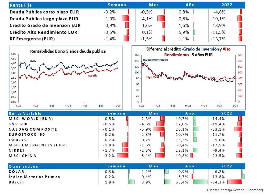 Va por modas. Unas veces todo el mercado se ve influenciado por el precio del petróleo, otras el de una determinada acción, otras por el diferencial de crédito o la prima de riesgo periférica. Esta semana el centro de atención es la rentabilidad del bono americano a 10 años que parece irremediablemente acercarse al psicológicamente importante 5%. En la zona euro, el bono alemán al mismo vencimiento también repunta y prácticamente toca el 3%.
