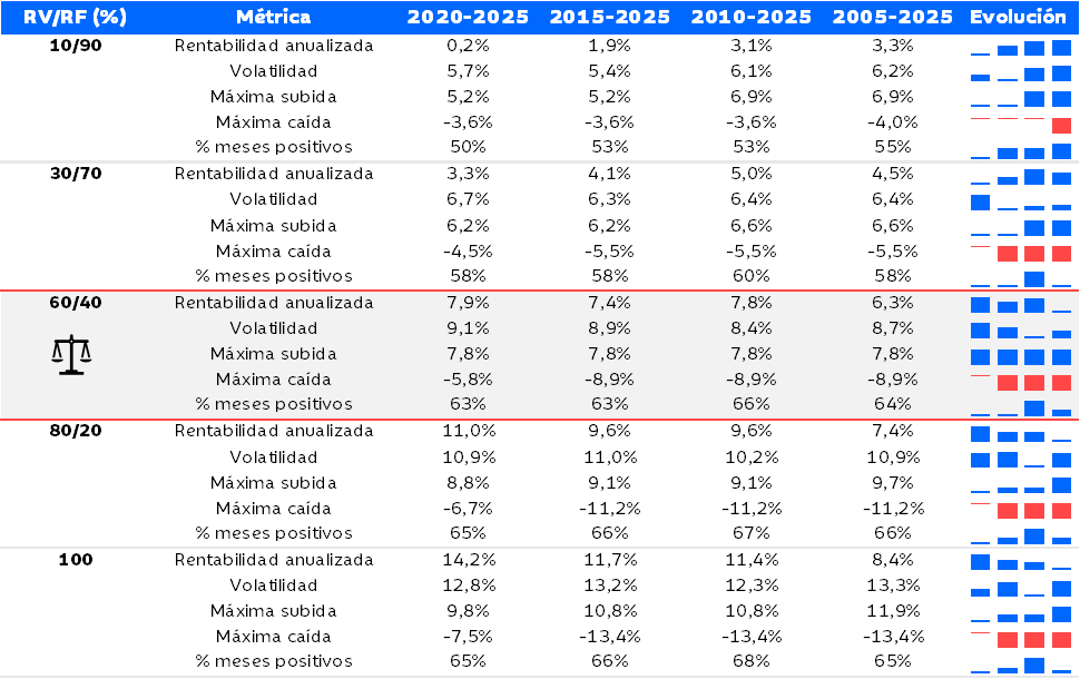 - Historial sólido: a largo plazo, ha ofrecido buenos resultados con menor volatilidad que una cartera 100 % en acciones.