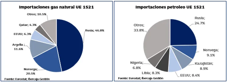 Europa es muy dependiente de las exportaciones de gas natural, especialmente los países de Centroeuropa, como Alemania, y los países bálticos. Según Eurostat, 47% de las importaciones de gas natural de la Unión Europeo durante los primeros seis meses de 2021 provenían de Rusia. Asimismo, el 25% del petróleo importando por la UE proviene de Rusia. Por tanto, Rusia es nuestro principal socio comercial en términos energéticos y tenemos una gran dependencia de ésta. Sin embargo, es una dependencia mutua, ya que la venta de gas natural y petróleo a la UE es una de las principales fuentes de financiación del gobierno ruso y uno de los motores de su economía.