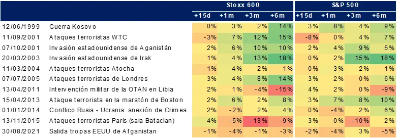 En este contexto es interesante ver que ha hecho el mercado ante situaciones de escalada militar similar. Los eventos que hemos seleccionado son las Guerra de Kosovo (1999), lo atentados a las Torres Gemelas en 11 de septiembre (2001), la Guerra de Irak (2003), la anexión de Crimea por parte de Rusia (2014) y la actual escalada de tensión entre Ucrania y Rusia.
