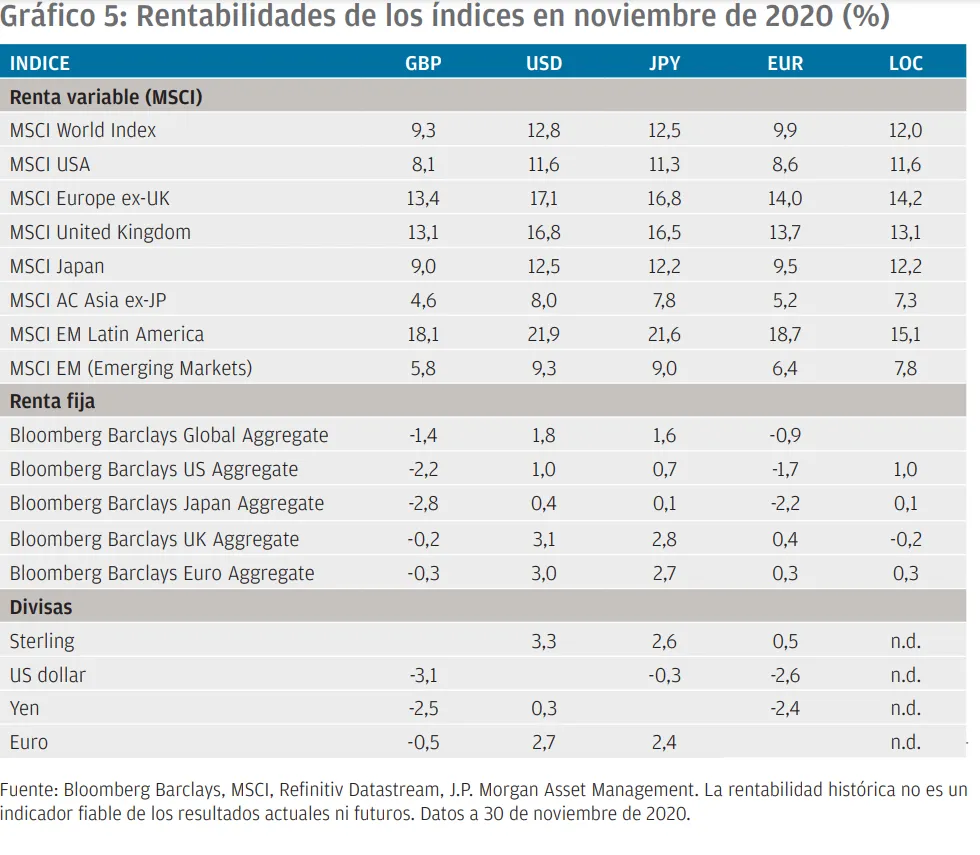 En los próximos años, cuando se recuerde la crisis de la COVID-19 y el que fue un año angustioso a nivel mundial, es probable que noviembre se considere como un punto de inflexión. El anuncio de la disponibilidad de tres vacunas eficaces contra el virus hizo que los mercados mostraran una mayor propensión al riesgo, además de intensificar el repunte observado tras las elecciones de Estados Unidos, dejando en un segundo plano las preocupaciones por la perspectiva económica a corto plazo. Los mercados de renta variable acogieron con esperanza la luz al final del túnel, siendo noviembre el mes del año donde los que sufrieron más pérdidas obtuvieron mejores resultados: la rentabilidad de los índices MSCI Europe ex-UK y FTSE All-Share fue del 14,2% y del 12,7%, respectivamente. Incluso los índices con mejores resultados en lo que va de año, Asia ex-Japan y US, consiguieron unas ganancias mensuales impresionantes del 8,0% y del 11,0%. Las acciones de valor a nivel mundial obtuvieron una rentabilidad del 15,1%, superando a las de crecimiento, con una rentabilidad del 10,9%. Por su parte, en la renta fija fueron el high yield, con un mayor nivel de riesgo, así como los mercados emergentes donde se consiguió eclipsar a los mercados de mayor calidad.