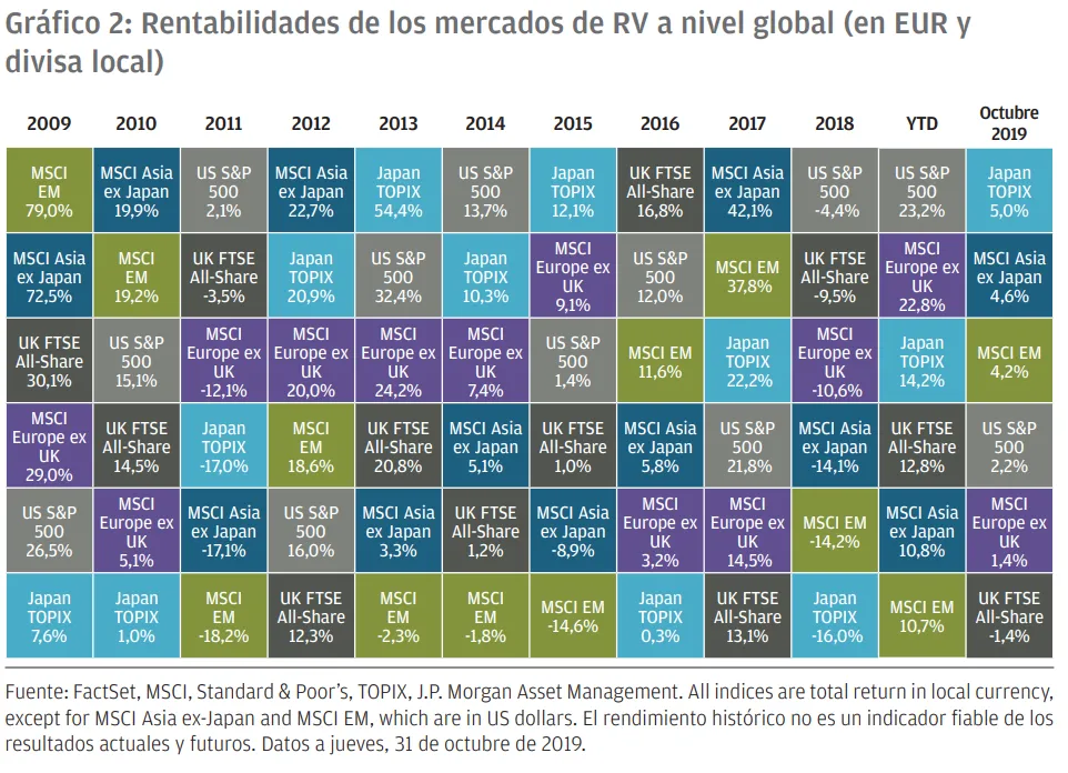 Octubre fue un buen mes para los mercados de renta variable, con los mercados emergentes arrojando una rentabilidad del 4,2 % frente al 2,6 % de los mercados desarrollados. El S&P 500 subió un 2,2 % adicional y registró nuevos máximos históricos a finales de mes. La libra se revalorizó un 5,0 % y un 2,9 % frente al dólar y al euro, respectivamente, a medida que los mercados percibían que el riesgo de un Brexit sin acuerdo había disminuido. El repunte de la libra esterlina supuso que el FTSE All-Share, con aproximadamente el 70 % de sus ingresos procedentes del extranjero, fuera uno de los mercados de renta variable con peor rentabilidad y cayera un 1,4 % durante el mes. En la renta fija, los mercados de crédito obtuvieron mejores resultados que los bonos gubernamentales, con la deuda de grado de inversión global generando una rentabilidad del 1,2 % frente al 0,5 % de los bonos gubernamentales globales.