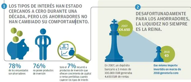 En 2007, era posible obtener 4.650 euros de rentas por una inversión en un depósito bancario a tres meses de 100.000 euros. Esta misma cantidad invertida en marzo de este año generaría cero euros. La rentabilidad real media anualizada de la liquidez a lo largo de aproximadamente las dos últimas décadas, de 2000 a 2017, es negativa (-0,6%) comparada con la renta variable en el 4% y los bonos en el 4,6% (fuente: Guide to the Markets- J.P. Morgan Asset Management). En otras palabras, los ahorradores que se aferran a las cuentas corrientes están perdiendo dinero.