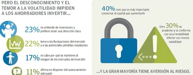 Cuando preguntamos sobre las principales razones para no tener productos de inversión (aparte de la falta de ahorro), la mayor parte de los consumidores europeos afirman tener miedo de asumir riesgos o confiesan no conocer el funcionamiento de los mercados de capitales.