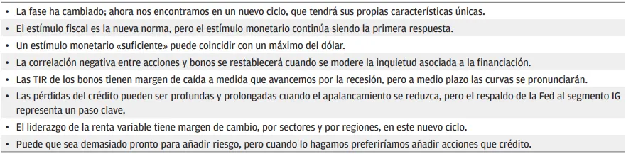La recesión y el nuevo ciclo tendrán sus propias características diferenciadas. Los responsables políticos han respondido más ampliamente que en cualquier crisis anterior, y al igual que la política monetaria acomodaticia definió el pasado ciclo, el uso generalizado de la política fiscal definirá el próximo. Por el momento, la política monetaria es la primera respuesta a la crisis y seguirá siendo así hasta que los problemas de financiación se moderen —lo que probablemente vendrá precedido por una inversión sostenida de la reciente solidez del dólar estadounidense.