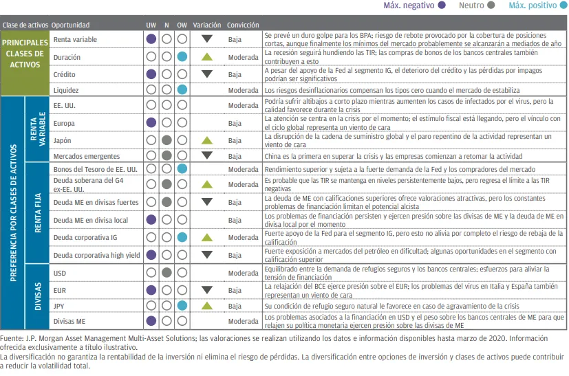 En tiempos de normalidad, estas consideraciones sobre las clases de activo resultan de aplicación en un horizonte de 12 a 18 meses. Sin embargo, dada la actual volatilidad e incertidumbre, reflejan un horizonte de varios meses, aunque están sujetas a revisión a medida que se disponga de nueva información. Actualizaremos esta tabla al menos con una periodicidad mensual durante este periodo de volatilidad. Los puntos representan nuestra visión direccional, las flechas arriba/abajo indican una variación positiva o negativo de nuestra visión desde la última revisión. Estos puntos de vista no deben interpretarse como recomendaciones de cartera. Este resumen de nuestras opiniones sobre las clases de activo individuales indica la fortaleza de la convicción y las preferencias relativas en toda una amplia gama de activos pero es independiente de las consideraciones de construcción de cartera.