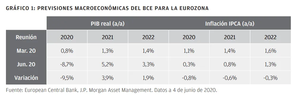 Las nuevas previsiones macroeconómicas revelan que el BCE prevé una caída del PIB del -8,7% en 2020 —cerca del límite mínimo del rango de sus expectativas—. Esto pone de relieve la simple verdad de que la eurozona se enfrenta al mayor declive económico de su historia. Hasta la fecha muchas economías han podido retirar con prudencia las medidas de confinamiento sin un aumento significativo de los nuevos casos, pero todavía es muy temprano para decir con confianza que el camino por recorrer será fácil. Por el momento todas las mejoras de los datos económicos han sido moderadas y el BCE sigue observando riesgos bajistas para su actual estimación para el PIB de 2020. El banco central prevé una caída del PIB real del 12,5% para este año en caso de que un rebrote de los casos de infectados provoque un nuevo endurecimiento de las medidas de contención.