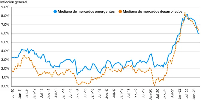 Los bancos centrales de los mercados emergentes actuaron pronto y de manera decisiva en 2021, cuando pocos en todo el mundo vieron que surgían graves problemas inflacionarios. En términos acumulados, los bancos centrales de mercados emergentes han aumentado los tipos de interés oficiales en 28.000 puntos básicos (pb) desde enero de 2021, en comparación con solo 5.000 pb de los bancos centrales de mercados desarrollados. Esto se debe a los estrictos objetivos de inflación y a las grandes mejoras en la credibilidad de los mercados emergentes. En consecuencia, los mercados emergentes se encuentran ahora firmemente en una fase desinflacionaria. Así pues, esperamos que la inflación media de los mercados emergentes disminuya al 5% para finales de año en comparación con el 9,6% de principios de 2023. Por el lado del crecimiento, si bien se espera cierta desaceleración dado el debilitamiento de los fundamentales globales y los tipos de interés más altos, las economías emergentes están demostrando ser más resilientes que en ciclos anteriores. Esto se debe en gran medida al repunte del consumo chino, a los precios más altos de las materias primas que protegen los presupuestos públicos y las finanzas de las empresas, y a unas empresas de mercados emergentes que se ajustan mejor a una mayor volatilidad en los tipos que sus homólogas de mercados desarrollados.