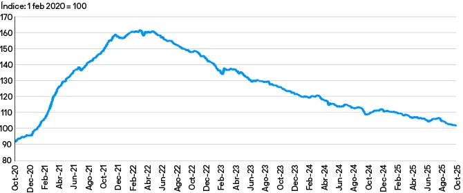 En las últimas semanas, la tir de los bonos del Tesoro estadounidense a 10 años se ha mantenido en un rango estrecho de entre el 4,00% y el 4,15%, desplazándose recientemente hacia el extremo superior de dicho rango. La combinación de la mayor disponibilidad de datos y la perspectiva de un mayor debilitamiento del mercado laboral hace que los bonos del Tesoro a medio plazo resulten cada vez más atractivos desde una perspectiva ajustada por el riesgo. El retorno de las correlaciones "favorables" con la renta variable —donde los bonos del Tesoro suben y la renta variable cae— ha reafirmado la reputación defensiva de esta clase de activo. Esto cobra especial relevancia dada la reciente volatilidad en los mercados bursátiles, con el S&P 500 cayendo casi un 4% desde sus máximos de octubre. En este contexto, invertir en bonos a medio plazo (vencimientos de 5 a 10 años) ofrece un equilibrio favorable entre rentabilidad y estabilidad de precios, especialmente, si los mercados siguen previendo una política monetaria acomodaticia por parte de la Reserva Federal.