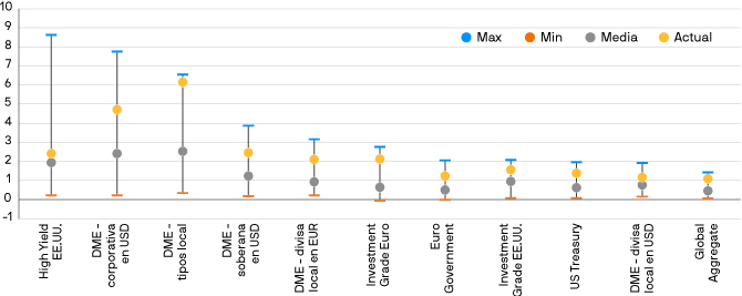 En el caso de la mayoría de los bonos de mercados emergentes, los inversores observarán que estos mercados suelen negociarse con una prima por diferencial con respecto a los bonos de mercados desarrollados con calificación similar. Esto se debe al mayor nivel de riesgo que se espera de los mercados emergentes. Sin embargo, el riesgo percibido suele ser mayor que el riesgo real, lo que hace que esta prima por diferencial ofrezca una amplia compensación a los inversores a largo plazo. En el segmento de deuda en divisa local, las tires reales de los mercados emergentes son elevadas dada la inflación contenida, lo que ofrece a los bancos centrales de dichos mercados la oportunidad de recortar los tipos de interés y a los inversores de beneficiarse tanto de los ingresos corrientes como de la posible apreciación del capital.
