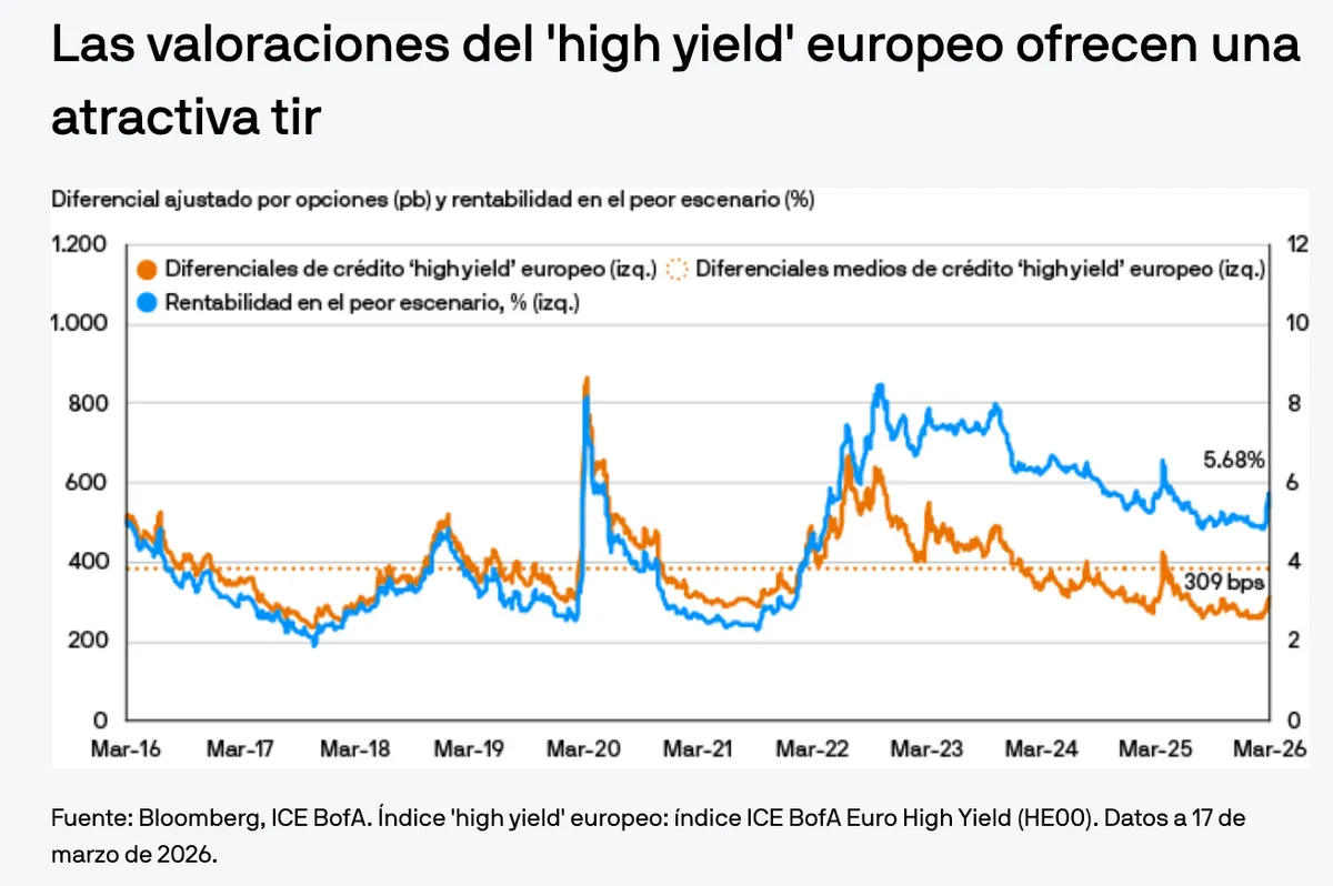 Tras 11 meses consecutivos de rentabilidad positiva (hasta febrero de 2026), los diferenciales de crédito siguen ofreciendo fundamentales decentes e indicadores técnicos sólidos, pero una menor compensación para el caso de que se registre volatilidad macroeconómica. Sin embargo, las atractivas tires en comparación con periodos recientes con diferenciales en niveles similares, junto con la duración relativamente corta del mercado, proporcionan cierta seguridad frente a una mayor volatilidad. En nuestra opinión, un retroceso en los diferenciales crearía una oportunidad de compra más clara y generalizada en el crédito 'high yield' europeo; hasta entonces, las estrategias del 'high yield' de duración corta son las más atractivas. El panorama para la gestión activa ha mejorado y ofrece un buen potencial para la generación de alfa mediante una selección de crédito disciplinada y 'bottom-up'.