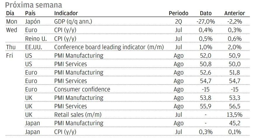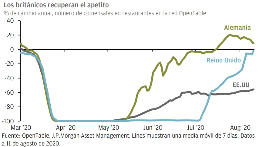 En cambio, el sector de la hostelería en EE.UU sigue bajo presión, ya que el número de casos de Covid-19 se mantiene elevado, mientras que Alemania ha conseguido una recuperación más rápida y sólida gracias a un mejor control del virus. Los datos del PIB real del segundo trimestre publicados este miércoles confirmaron la magnitud del desafío al que se enfrenta la economía británica, con una reducción del crecimiento de más de un 20% con respecto al trimestre pasado. Dado que el impacto en la actividad está siendo cada vez más variado entre sectores a medida que avanza la recuperación, se pondrá a prueba la creatividad de los gobiernos para dar apoyo específico a las industrias más afectadas.