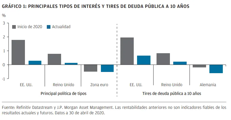 Los bancos centrales de todos los mercados desarrollados han reducido los tipos de interés de una forma muy agresiva y han lanzado enormes programas de flexibilización cuantitativa. Estas acciones desempeñan un papel fundamental para garantizar que los gobiernos lancen paquetes de incentivos fiscales considerables, pero tienen como consecuencia que ahora sea mucho más difícil encontrar rentas con bajo riesgo. Véase el Gráfico 1.