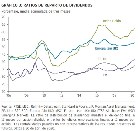 Las rentas de dividendos en EE. UU. también se verán sometidos a presión en 2020, pero es probable que resistan más que en otras regiones. En primer lugar, el mercado estadounidense se beneficia de una ratio de distribución de dividendos más baja, es decir, se pagan dividendos en función de los beneficios empresariales. Unas ratios de pago más bajas dan a las empresas mayor flexibilidad para mantener los dividendos durante los períodos en que se obtienen menos beneficios (Gráfico 3). Uno de los motivos por los que la ratio de reparto es menor es que las empresas estadounidenses suelen realizar grandes recompras para distribuir efectivo entre los accionistas. Cuando los beneficios empresariales se ponen en entredicho, es más probable que se reduzcan estas recompras que los dividendos, lo que proporciona a los inversores un cierto margen antes de que los dividendos se vean afectados. La presión reguladora sobre los dividendos bancarios también es menor en Estados Unidos.
