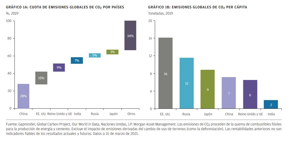 «Evidentemente los niveles absolutos de emisiones GEI solo cuentan una verdad a medias respecto al impacto ambiental relativo que causa cada país. Como mínimo, debemos tener en cuenta las diferencias en el tamaño de la población fijándonos en las emisiones per cápita. Además, tal vez queramos reflejar el hecho de que los países se hallan en distintas etapas de crecimiento económico. Históricamente, los mercados emergentes han contribuido menos a las emisiones GEI globales porque su producción económica ha sido inferior. Para comprender el impacto que estos países tendrán en el futuro, a medida que siguen aumentando su producción económica, es posible que queramos conocer también sus emisiones por unidad de PIB al comparar los países de mercados desarrollados con sus homólogos emergentes. Por otro lado, algunos países de mercados emergentes generan emisiones CO2 más altas porque los países occidentales han deslocalizado la producción de productos intensivos en CO2: el 14% de las emisiones de CO2 de China se atribuyen a productos que se exportan y se consumen en el extranjero. Contabilizar las emisiones que los países han trasladado a otras regiones es compatible con el creciente interés en las emisiones de “Alcance 3” de las empresas (tal como las define el Protocolo sobre Gases de Efecto Invernadero), que tienen en cuenta las emisiones que las empresas han externalizado en su cadena de suministro. Adoptamos un enfoque similar respecto a las empresas, no sobre los países, y tendríamos en cuenta los gases de efecto invernadero con relación al tamaño de la empresa».