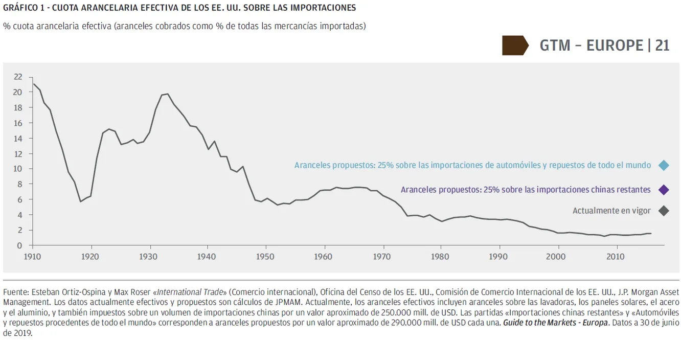 Las tensiones comerciales globales comenzaron en 2018, cuando el Gobierno estadounidense impuso aranceles a determinadas importaciones, incluidos los paneles solares y los metales, poniendo fin así a un proceso de varias décadas de liberalización comercial en el país. Desde entonces, los aranceles como porcentaje del conjunto de las importaciones se han mantenido en niveles relativamente bajos. Pero, si los EE. UU. siguen adelante con los recargos adicionales previstos sobre las importaciones chinas y se aplican nuevos impuestos a las importaciones del sector del automóvil, la tasa media de los aranceles estadounidenses volverá a niveles no vistos desde la década de 1940 (Gráfico 1).