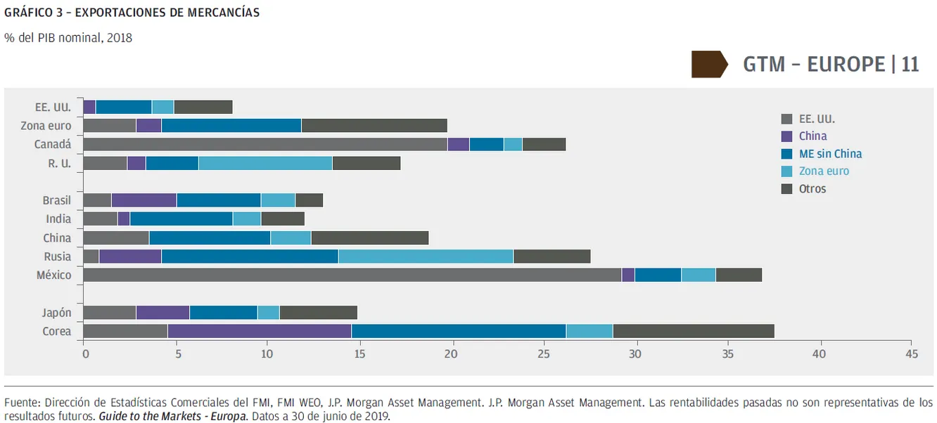 Estos efectos directos de los aranceles son pequeños en comparación con los efectos indirectos. Ante la incertidumbre geopolítica, las empresas están aplazando sus planes para invertir, lo que ya está frenando a la industria global y a las exportaciones. La economía de la zona euro parece especialmente vulnerable a esta situación, ya que muchos de sus países poseen economías orientadas a la exportación (Gráfico 3). La Unión Europea (UE) se enfrenta también a una posible subida de los aranceles estadounidenses en el sector automovilístico. En la actualidad, los automóviles fabricados en la UE se gravan con un arancel del 2,5% en EE. UU. (del 25% en el caso de los camiones y furgonetas), mientras que el gravamen que impone la UE a los coches importados desde EE. UU. es del 10%. EE. UU. es el principal mercado de los fabricantes de automóviles europeos, con 1.155.500 unidades exportadas a EE. UU. en 2018, cuatro veces más que los coches estadounidenses exportados a la UE.