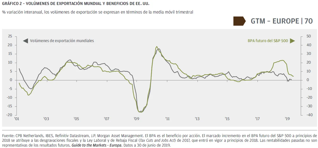 El Gráfico 2 muestra la correlación entre la disminución de los volúmenes de las exportaciones mundiales y el descenso de los beneficios futuros del S&P 500. La incertidumbre económica y el descenso de los beneficios podrían empañar aún más las inversiones corporativas y de capital, ya de por sí estancadas.