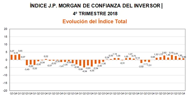 La confianza del inversor español se mantiene en valores optimistas en el último trimestre de 2018, cerrando así dos años consecutivos en niveles positivos. Así lo revela la última Encuesta de Confianza del Inversor español que elabora trimestralmente J.P. Morgan Asset Management desde hace 10 años.