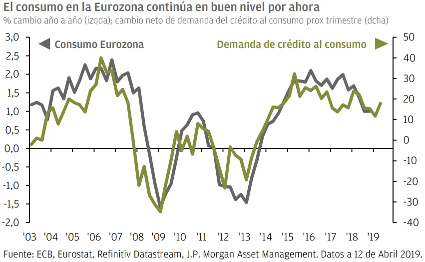 El último informe muestra que, a pesar de una moderación en el consumo de la eurozona tras unos niveles muy altos, todavía se espera que la demanda del crédito al consumo continúe siendo sólida en los próximos meses, lo que debería servir de apoyo al consumo. Pero también es cierto que si la debilidad en el sector manufacturero continúa, esto podría llevar a un retraso del gasto por parte de los consumidores, lo que podría llevar a una ralentización de la economía doméstica.