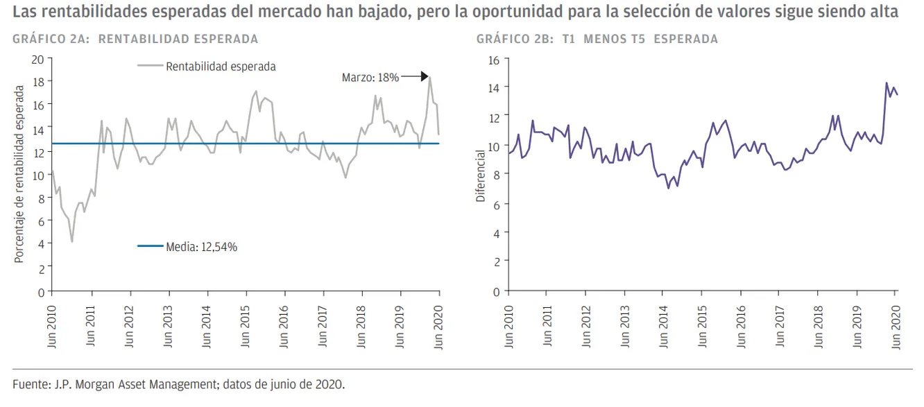 Comparados con finales del mes de marzo, los precios del mercado de renta variable parecen menos atractivos. Los mercados emergentes, por ejemplo, alcanzaron 1,2x precio-valor contable (el mínimo de 2008) antes de rebotar a 1,6x, que es algo razonable pero ya no tan destacable. Los múltiplos de beneficios a corto plazo parecen elevados en muchos casos y ya anticipan un importante rebote de los beneficios. La valoración que sobresale es la comparación entre la renta variable y la deuda soberana; basándonos en pasadas normas, podríamos ver al S&P 500 cotizando un 30% más alto que los niveles de hoy si esta fuera la única consideración. Pero esto parece muy improbable. En general, esperamos rentabilidades normales, moderadas desde estos niveles, como hacíamos a principios de año (GRÁFICO 2).
