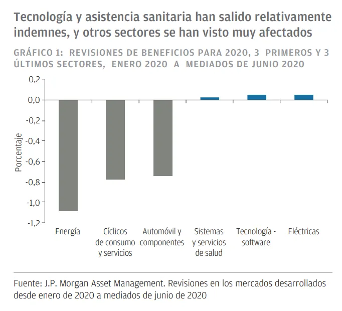 Nuestro equipo de análisis ha estado recalibrando rápidamente las estimaciones de beneficios a corto plazo desde el comienzo del cierre, recortando más del 30% desde nuestras expectativas para 2020 y el 20% para 2021. En este punto, creemos que hemos capturado la escala completa de la disrupción, e incluso hemos visto razones en las últimas semanas para aumentar las cifras en un puñado de casos. Donde hemos reducido las estimaciones desde el comienzo de la COVID-19, las diferencias entre sectores son mucho más importantes que entre regiones.