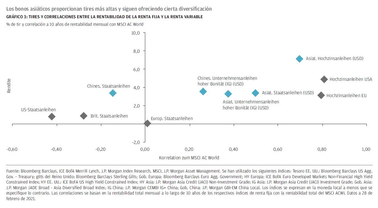 Al igual que en el mundo desarrollado, la deuda en Asia ha aumentado a consecuencia de la pandemia, pero la ratio de deuda pública total en proporción al PIB sigue siendo parecida o inferior a la de la mayoría de los países del G7. Por lo tanto, los inversores dispuestos a asumir el riesgo de divisas pueden incorporar los bonos asiáticos que ofrecen mayores tires con una calificación media de A. Pese a que los bonos asiáticos muestran una correlación con la renta variable superior a la de los bonos de deuda pública de los mercados desarrollados, pueden aportar diversificación a las carteras, con las ventajas que eso conlleva (GRÁFICO 3).