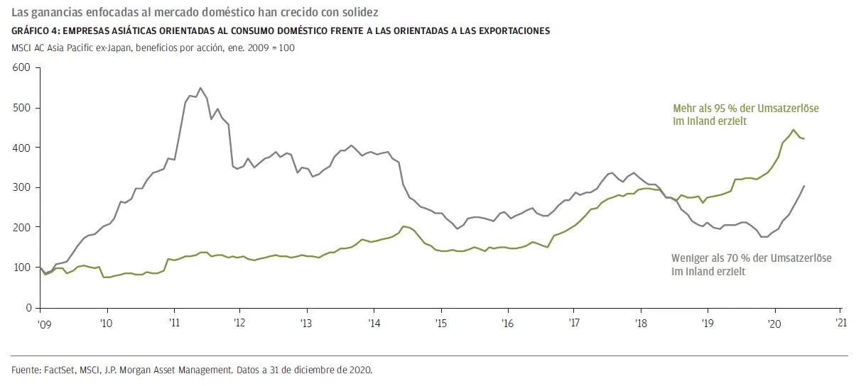 2. El milagro de la clase media. En 2030, cerca de dos tercios de la clase media mundial vivirán en Asia y generarán un consumo adicional de 18 billones anuales según las previsiones. Desde 2009, las compañías asiáticas con un marcado enfoque en el mercado doméstico han cuadruplicado sus beneficios y han mostrado un mejor comportamiento que las empresas más orientadas a las exportaciones. Además, cabe señalar que las ganancias enfocadas al mercado doméstico han mostrado una volatilidad considerablemente inferior (GRÁFICO 4). Los legisladores de la región estarán más que dispuestos a garantizar que las compañías asiáticas reciban el pedazo del pastel que les corresponda para satisfacer la demanda doméstica futura. La Asociación Económica Integral Regional (RCEP, por sus siglas en inglés) es el nuevo acuerdo de libre comercio en el que participan 10 países de la ASEAN más China, Japón, Corea, Australia y Nueva Zelanda, y puede considerarse como una medida para incentivar la producción y el comercio intra-regional.