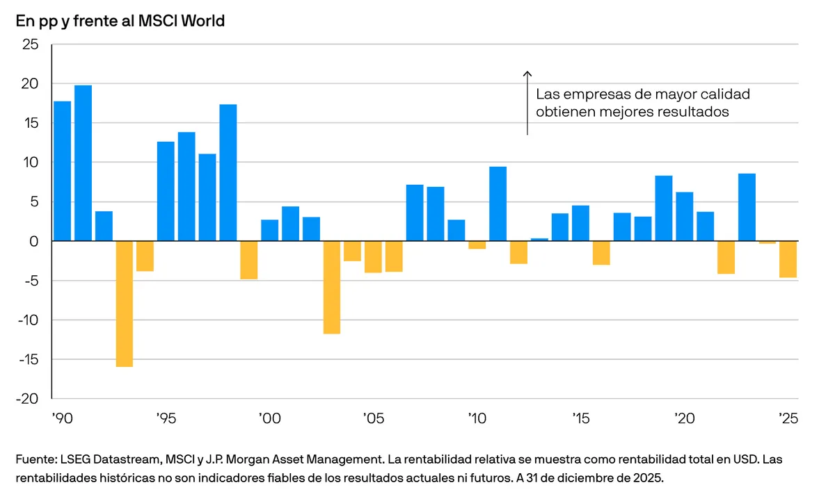 No obstante, esta diferencia no ha sido una constante. En los mercados desarrollados, las empresas de mayor calidad han perdido frente a otros estilos de inversión en 13 de los últimos 35 años, y precisamente el año pasado es un ejemplo perfecto. El 2025 fue el peor año en términos relativos para las empresas de alta calidad desde el 2003, ya que su rentabilidad fue 5 puntos porcentuales (pp) inferior a la del conjunto de los mercados desarrollados. Esta tendencia se dio en todas las regiones importantes, aunque fue especialmente palpable en los mercados emergentes y el Reino Unido, donde las pérdidas fueron de 20 y 14 pp, respectivamente.