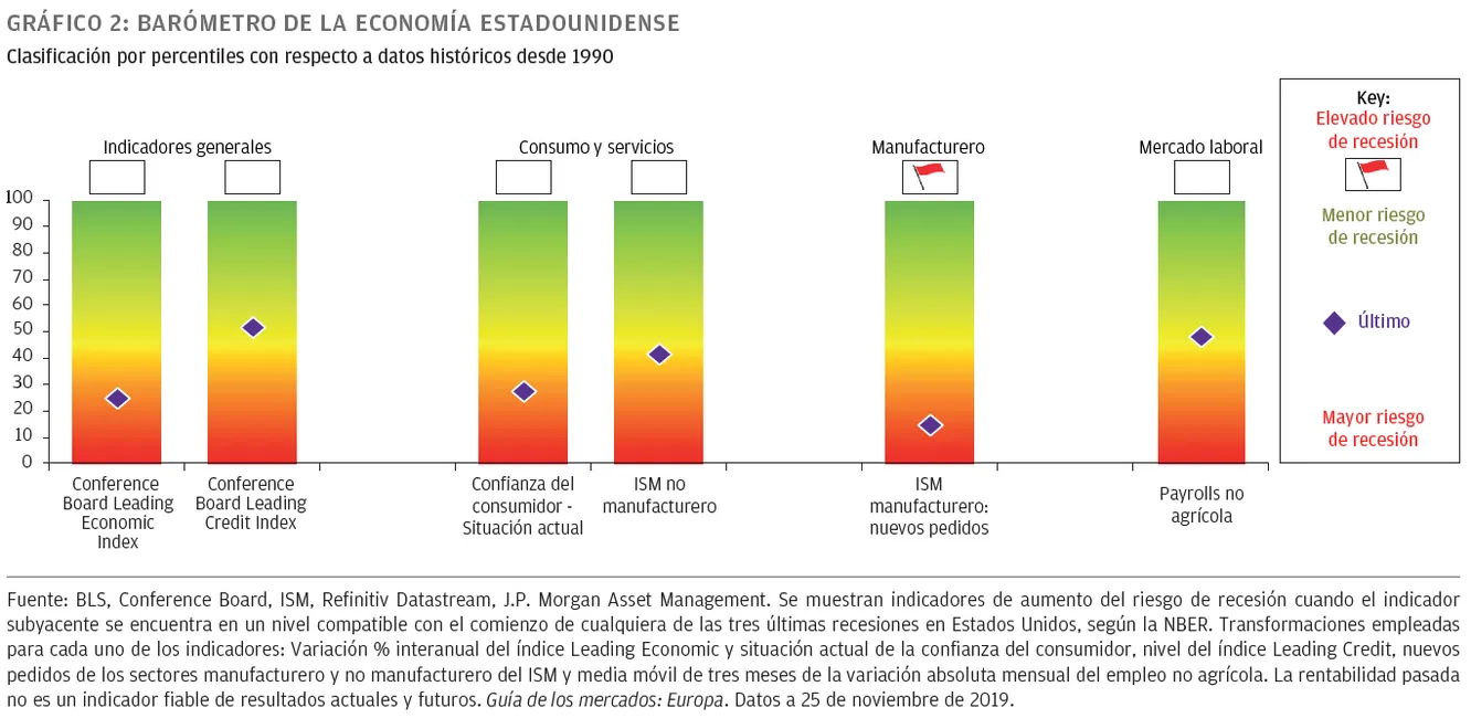 Si las tensiones geopolíticas persisten pero no se recrudecen, es de esperar que nos enfrentemos a una ralentización de la economía, más que a un estancamiento. Sin embargo, se trata de un condicionante muy significativo. Nuestro barómetro de la economía de Estados Unidos (Gráfico 2), que adoptamos recientemente, ilustra los indicadores clave de actividad económica de dicho país y nos ayudará a seguir la evolución de los riesgos en los próximos meses.