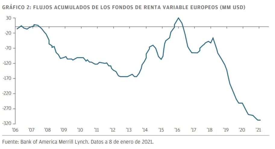 Detrás de la preferencia por la renta variable estadounidense también ha estado un dólar fuerte, que ha ayudado a incrementar las rentabilidades de los inversores y ha alejado de los mercados europeos flujos de fondos que se estiman en 250.000 millones de USD en los últimos tres años naturales (GRÁFICO 2).