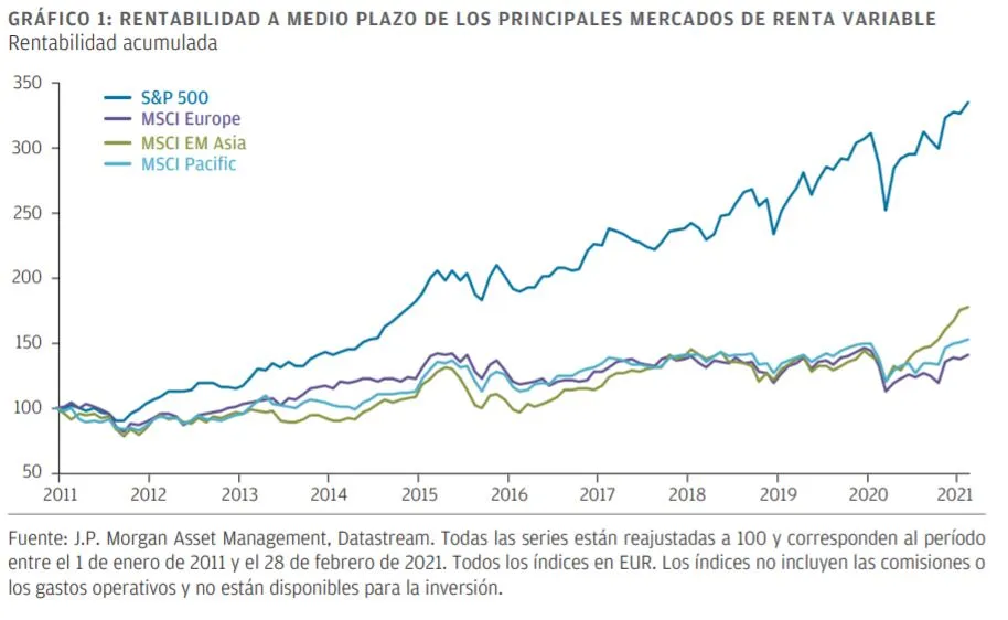 El mercado bursátil estadounidense ha sido el destino de los inversores en una época en que los bajos tipos de interés y la expansión cuantitativa les han obligado a ir en busca de valores de crecimiento. En la última década, el S&P 500 ha repuntado un 335%, mientras que el MSCI Europe solo lo ha hecho un 141% (GRÁFICO 1).