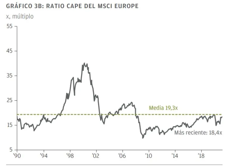 En comparación con otras empresas similares de Estados Unidos, las empresas europeas también se negocian con descuento. Como en otras regiones, los mercados europeos están polarizados entre acciones de crecimiento que están caras y acciones de valor que están baratas, aunque las primeras están mucho más baratas en Europa. La rentabilidad por dividendo también es atractiva, en torno al 3%, cerca de la media a largo plazo de la región, y ofrece una mejora sustancial respecto a la rentabilidad de los bonos europeos, que en muchos casos es negativa (GRÁFICOS 3A, 3B y 3c).