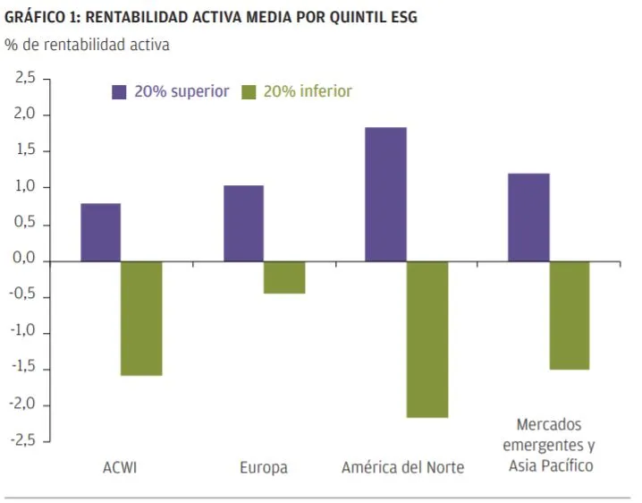 Fuente: J.P. Morgan Asset Management. En el gráfico se muestra la rentabilidad activa media de las carteras de los quintiles superiores e inferiores, según la puntuación ESG cuantitativa propia de JPM, en USD y con los costes de transacción excluidos. Los periodos del cálculo son del 31/12/2012 al 26/02/2021 en el caso del ACWI, Europa y América del Norte; y del 28/02/2013 al 30/11/2020 en el caso de los mercados emergentes y Asia Pacífico. Las cifras se muestran como una tasa anual. Las carteras y los índices de referencia del ACWI se han construido en el universo del MSCI ACWI IMI filtrando por una capitalización de mercado >1.000 millones $. Las carteras de Europa se han construido empleando los componentes europeos del susodicho universo, mientras que las respectivas de América del Norte se han construido empleando los componentes norteamericanos del referido universo. Por último, las carteras de los mercados emergentes y Asia Pacífico se han construido a partir del índice MSCI Emerging Markets. Las acciones cuentan con ponderaciones idénticas en todo el universo. Las rentabilidades anteriores no son indicadores fiables de los resultados actuales y futuros. Datos a 28 de febrero de 2021.
