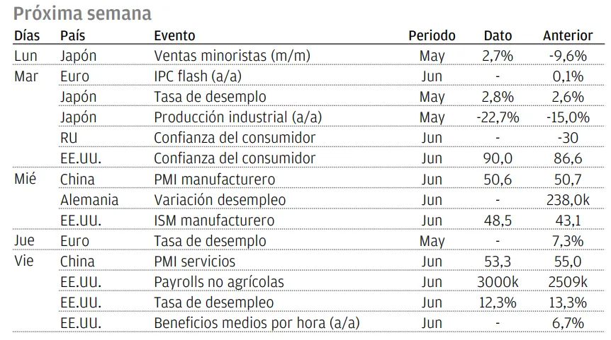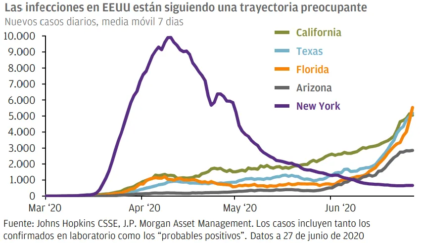 Ha habido una aceleración de nuevos casos de Covid-19 en algunos de los estados de EE.UU. California, Texas, Florida y Arizona – que representan el 30% de la población EE.UU.- han sufrido un nuevo repunte la semana pasada. Esto podría poner presión sobre el sistema de salud y ralentizar la recuperación económica. Los datos de movilidad de Google muestran que estos cuatro estados están ahora entre los menos activos a pesar de la relajación en las medidas de confinamiento, destacando que las empresas y los consumidores están siendo ellos también precavidos con la vuelta a la normalidad.