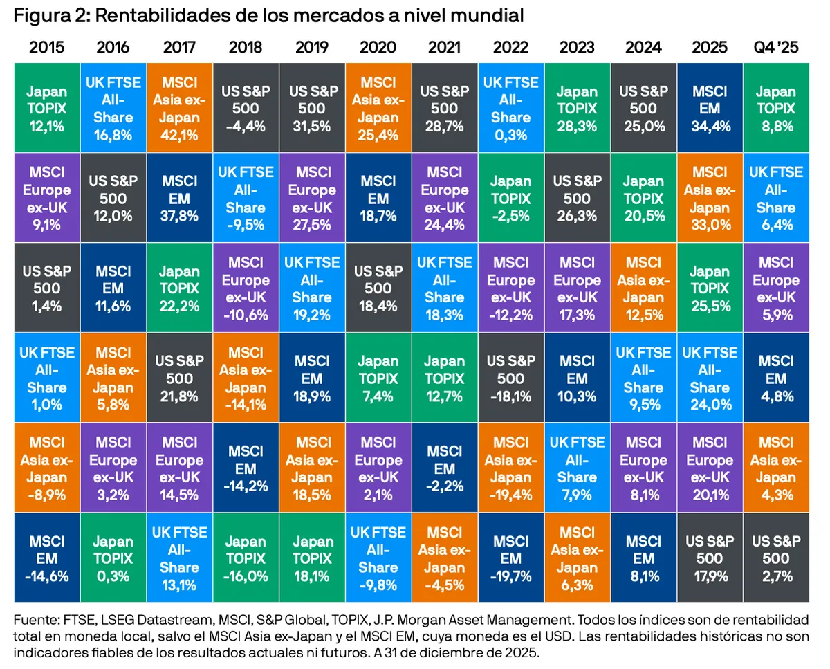 El presente documento es una publicación con carácter general y fines exclusivamente informativos. Su naturaleza es divulgativa y no ha sido diseñado para servir como asesoramiento ni recomendación sobre ningún producto o estrategia de inversión específico ni sobre características de planes concretos u otro material en ninguna jurisdicción. Por tanto, ni J.P. Morgan Asset Management ni ninguna de sus filiales poseen compromiso alguno de participar en ninguna de las transacciones mencionadas en este documento. Los ejemplos utilizados tienen carácter genérico o hipotético y se facilitan exclusivamente con fines ilustrativos. Dado que esta publicación no contiene información suficiente para respaldar una eventual decisión de inversión, no deberá basarse en ella para evaluar las ventajas de invertir en ninguno de los valores o productos mencionados en ella. Asimismo, los usuarios deben evaluar de manera independiente las consecuencias legales, reglamentarias, fiscales, crediticias y contables, y determinar, junto con sus propios asesores profesionales, si alguna de las inversiones aquí mencionadas se considera adecuada para alcanzar sus propios objetivos personales. Los inversores deberán asegurarse de que obtienen toda la información relevante disponible antes de realizar cualquier inversión. Las previsiones, cifras, opiniones o técnicas y estrategias de inversión aquí reflejadas se ofrecen exclusivamente para fines informativos, sobre la base de ciertos supuestos y las condiciones actuales de mercado, y están sujetas a cambios sin previo aviso. Toda la información aquí incluida se considera exacta en el momento en que se ha elaborado, pero no se ofrece ninguna garantía de exactitud y no se acepta ninguna responsabilidad en relación con cualquier error u omisión. Cabe señalar que la inversión conlleva riesgos, que el valor de las inversiones y las rentas que estas generan pueden fluctuar en función de las condiciones del mercado y los convenios en materia tributaria, y que los inversores podrían no recuperar todo el dinero invertido. Ni la rentabilidad histórica ni las tires son indicadores fiables de los resultados actuales ni futuros. J.P. Morgan Asset Management es la marca del negocio de gestión de activos de JPMorgan Chase & Co. y sus filiales en todo el mundo. En la medida permitida por la legislación aplicable, J.P. Morgan Asset Management podría grabar las llamadas telefónicas y supervisar las comunicaciones electrónicas a fin de cumplir sus políticas internas y obligaciones legales y normativas. J.P. Morgan Asset Management recopilará, almacenará y tratará todos los datos personales de conformidad con nuestras políticas de privacidad, las cuales están disponibles en am.jpmorgan.com/global/privacy. Esta comunicación ha sido publicada por las siguientes entidades: En los Estados Unidos, por J.P. Morgan Investment Management Inc. o J.P. Morgan Alternative Asset Management, Inc., ambas reguladas por la Comisión de Bolsa y Valores. En América Latina, solo para uso por parte de beneficiarios concretos, por entidades locales de J.P. Morgan, según proceda. En Canadá, solo para uso por parte de clientes institucionales, por JPMorgan Asset Management (Canada) Inc., que es una Gestora de Carteras registrada y un Agente de Mercado Exento en todas la provincias y territorios de Canadá, salvo Yukón, y también está registrada como Gestora de Fondos de Inversiones en Columbia Británica, Ontario, Quebec y Terranova y Labrador. En el Reino Unido, por JPMorgan Asset Management (UK) Limited, que está autorizada y regulada por la Financial Conduct Authority; en otras jurisdicciones europeas, por JPMorgan Asset Management (Europe) S.à r.l. En Asia Pacífico (APAC), por las siguientes entidades emisoras y en las respectivas jurisdicciones en las que están principalmente reguladas: JPMorgan Asset Management (Asia Pacific) Limited, JPMorgan Funds (Asia) Limited o JPMorgan Asset Management Real Assets (Asia) Limited, todas ellas reguladas por la Securities and Futures Commission de Hong Kong. JPMorgan Asset Management (Singapore) Limited (n.º de reg. de la sociedad: 197601586K), si bien esta promoción o publicación no ha sido revisada por la Monetary Authority of Singapore, el organismo regulador del mercado en Singapur. JPMorgan Asset Management (Taiwan) Limited. JPMorgan Asset Management (Japan) Limited, que es miembro de la Investment Trusts Association, Japan (JITA); la asociación de asesores de inversión de Japón (Japan Investment Advisers Association), la Type II Financial Instruments Firms Association y la Japan Securities Dealers Association, y está regulada por la Agencia de Servicios Financieros de Japón (número de registro Kanto Local Finance Bureau [Financial Instruments Firm] No. 330). En Australia, por JPMorgan Asset Management (Australia) Limited (ABN 55143832080) (AFSL 376919) y solo para clientes mayoristas (wholesale clients) tal y como se indica en las secciones 761A y 761G de la ley de sociedades Corporations Act de la Commonwealth de 2001. En el resto de los mercados de Asia Pacífico, el documento solo está dirigido a los destinatarios previstos. Solo para EE. UU.: Si es usted una persona con una discapacidad y necesita ayuda adicional para ver el material, llámenos al 1-800-343-1113 para solicitar ayuda.