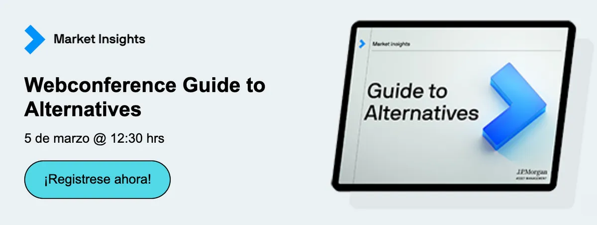 Tenemos el placer de invitarle a nuestra próxima webconference de Guide to Alternatives que tendrá lugar el jueves, 5 de marzo a las 12:30 hrs, en la que Pilar Martí-Fluxá, responsable de desarrollo de negocio de Alternativos de J.P. Morgan Asset Management en España, explicará los contenidos de la nueva edición de la guía correspondiente al primer trimestre de 2026, y cómo utilizarla para sacarle el máximo partido en las conversaciones con clientes.
