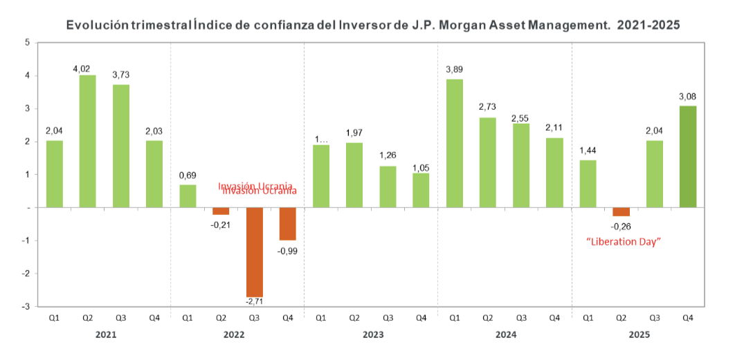 El optimismo entre los inversores y ahorradores españoles sobre la evolución futura de los mercados de valores sigue su escalada, y alcanzó a comienzos de 2026 uno de los niveles más altos registrados en el índice de confianza que elabora trimestralmente la gestora internacional J.P. Morgan Asset Management.