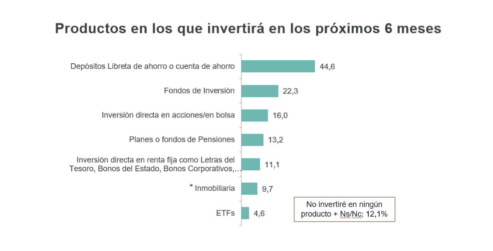 A pesar de la percepción mayoritaria en que las bolsas subirán o se mantendrán estables, el perfil conservador del ahorrador y el inversor español se mantiene casi invariable, así como sus objetivos y estrategias de inversión. Para el 36,5 % de los encuestados, su principal objetivo es “no perder dinero”; un 34,5 % reconoce que está dispuesto a obtener menos rentabilidad a cambio de cierta seguridad; y solo el 29 % afirma que invierte para conseguir la máxima rentabilidad posible. Esta actitud se traslada también a la intención de compra de productos financieros y de inversión. Casi la mitad de los encuestados, el 44,6 %, afirma que mantendrá su liquidez en depósitos, libretas y cuentas de ahorro. Para los que optarán también por productos de inversión, un 22 % dice que confiará en los fondos de inversión de renta variable o de renta fija, esta opción de inversión colectiva es la preferida de los inversores, por encima de la compra directa de acciones en bolsa o de letras del tesoro, bonos, etc. Un 13 % optará por fondos y planes de pensiones, y casi un 9% contempla también la inversión en activos inmobiliarios.