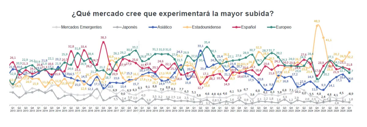 de optimismo, ahora, tres meses después, la bolsas americana se destaca, y es la preferida para el 32% de los encuestados (5 puntos más que hace tres meses) mientras que cae la confianza en Europa y España, y especialmente en los mercados asiáticos, economías que se ven más afectadas por la crisis energética derivada del conflicto en Oriente Medio.