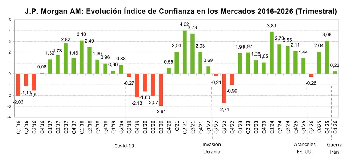 El índice de J.P. Morgan Asset Management que mide la confianza de los inversores en los mercados, cayó bruscamente y se situó en 0,24 en los tres primeros meses del año por el severo impacto sobre el ánimo de los inversores del conflicto en Oriente Medio.