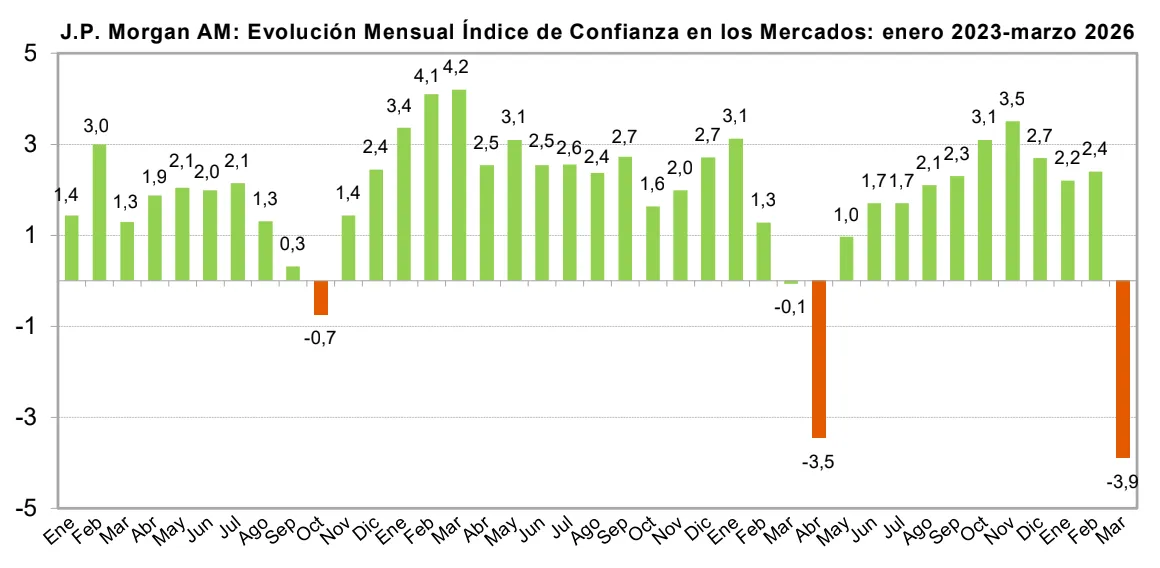Tras haber alcanzado a comienzos de 2026 uno de los niveles de optimismo más altos de toda la serie histórica de la encuesta que elabora desde 2007 J.P. Morgan AM, el índice se derrumbó en marzo de este año más de 6 puntos, desde los 2,4 puntos positivos de febrero, hasta situarse en -3,9. Una caída solo experimentada en 2022 con motivo de otro conflicto geopolítico, la invasión de Ucrania. En aquel momento, el índice registró tres trimestres consecutivos eminentemente pesimistas y solo comenzó a recuperarse en 2023.