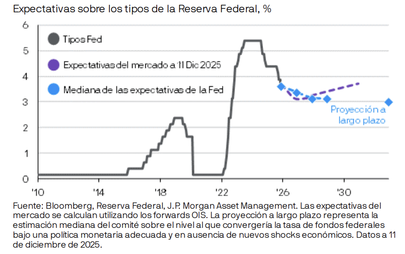 Los riesgos a la baja del mercado laboral estadounidense llevaron a la Reserva Federal (Fed) a realizar un tercer recorte consecutivo de tipos de forma "preventiva" en su reunión de diciembre. La Fed también publicó nuevas proyecciones económicas, en las que se revisaron al alza las expectativas de crecimiento para 2026, se redujeron las previsiones de inflación y se mantuvieron sin cambios las expectativas sobre los tipos de interés. Sin embargo, la divergencia de opiniones dentro del comité sugiere que existe un alto grado de incertidumbre sobre la trayectoria futura de los tipos, con los gobernadores Schmid y Goolsbee manifestando su desacuerdo a favor de mantener los tipos sin cambios. Los inversores esperan que los miembros más moderados del comité tengan mayor influencia el próximo año, pero si las devoluciones fiscales derivadas de la ley One Big Beautiful Bill impulsan la actividad y la inflación resulta más persistente, la Fed podría realizar menos recortes de los que el mercado descuenta actualmente.
