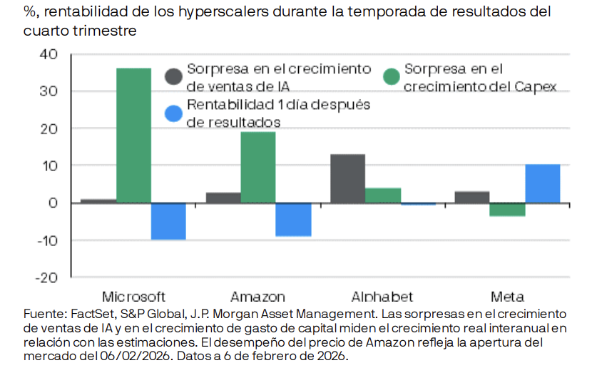 Las acciones tecnológicas de mega capitalización estuvieron bajo un intenso escrutinio durante la temporada de resultados del cuarto trimestre, a pesar de reportar beneficios sólidos. Los inversores cada vez más quieren ver que los niveles astronómicos de inversión en IA realizados por los hyperscalers se traduzcan en un aumento proporcional de los ingresos. Aquellos que anunciaron planes de mayor inversión en capital – como Microsoft, Amazon y Alphabet – fueron castigados por los mercados el día de la publicación de resultados. Por otro lado, Meta – con un incremento de gasto de capital menor de lo esperado – vio cómo el precio de su acción repuntó.