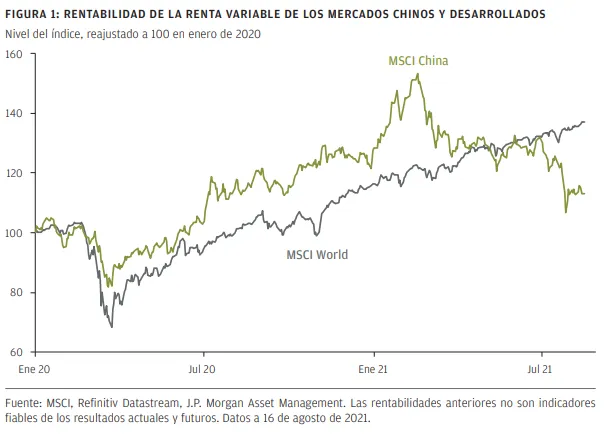 Tras haberse comportado mejor que otros mercados de valores regionales durante gran parte de la pandemia, los valores chinos han caído bruscamente durante los últimos meses (FIGURA 1). Si bien la fluctuación inicial se justificó en la inquietud en torno a la desaceleración de la economía china, las caídas más recientes han venido motivadas por un endurecimiento de la normativa centrado en sectores concretos. Este informe expone los motivos por los cuales mantenemos nuestro optimismo en torno a las perspectivas a medio plazo de los activos chinos, aunque reconocemos que, antes de que mejore la confianza hacia el mercado de valores, puede transcurrir cierto tiempo hasta que se esclarezca el alcance del citado endurecimiento de la normativa.