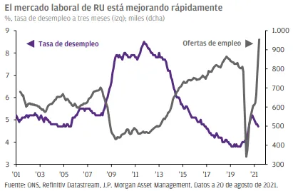 Los últimos datos económicos del Reino Unido apuntan a un aumento de la actividad económica y la contratación. La tasa de desempleo a tres meses bajó al 4,7% en junio y la tasa mensual cayó al 4,4% -un nivel que el Banco de Inglaterra no esperaba alcanzar hasta el tercer trimestre de 2022-. Con la oferta de puestos de trabajo en máximos históricos, el crecimiento del empleo en los próximos meses debería mantenerse sólido y ayudar a reenganchar a quienes actualmente se encuentran en situación de suspensión temporal de empleo, ya que el programa expira a finales de septiembre. La rápida mejora del mercado laboral abre la posibilidad de que el Banco de Inglaterra se muestre más agresivo y aumente los tipos de interés en el primer semestre del año que viene, lo que debería favorecer a la libra en los próximos meses
