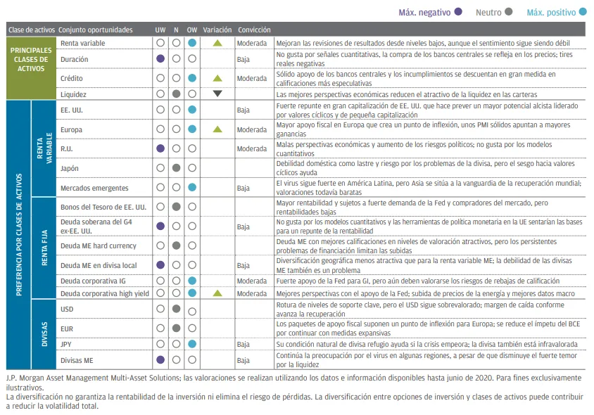 A medida que adoptamos gradualmente una opinión más positiva a raíz del giro observado en los datos económicos, por el hecho de que las revisiones de los resultados empresariales han tocado fondo y por el muro de contención que proporcionan los estímulos, mejoramos nuestra perspectiva para las acciones y el crédito de neutral a sobreponderar en nuestras carteras multi-activo. Hemos reducido nuestra perspectiva respecto a la duración de neutral a infraponderar y mantenemos este sesgo ligeramente negativo mientras recortamos nuestra sobreponderación moderada en liquidez hasta neutral. Estos cambios representan un mayor apetito por el riesgo y reflejan el proceso de dotar a nuestras carteras de mayor riesgo que comenzó a mediados del 2T. Tras comenzar con una rotación a crédito investment grade y seguir con posiciones cortas en renta variable cíclica, recientemente hemos añadido riesgo en deuda high yield y renta variable global.